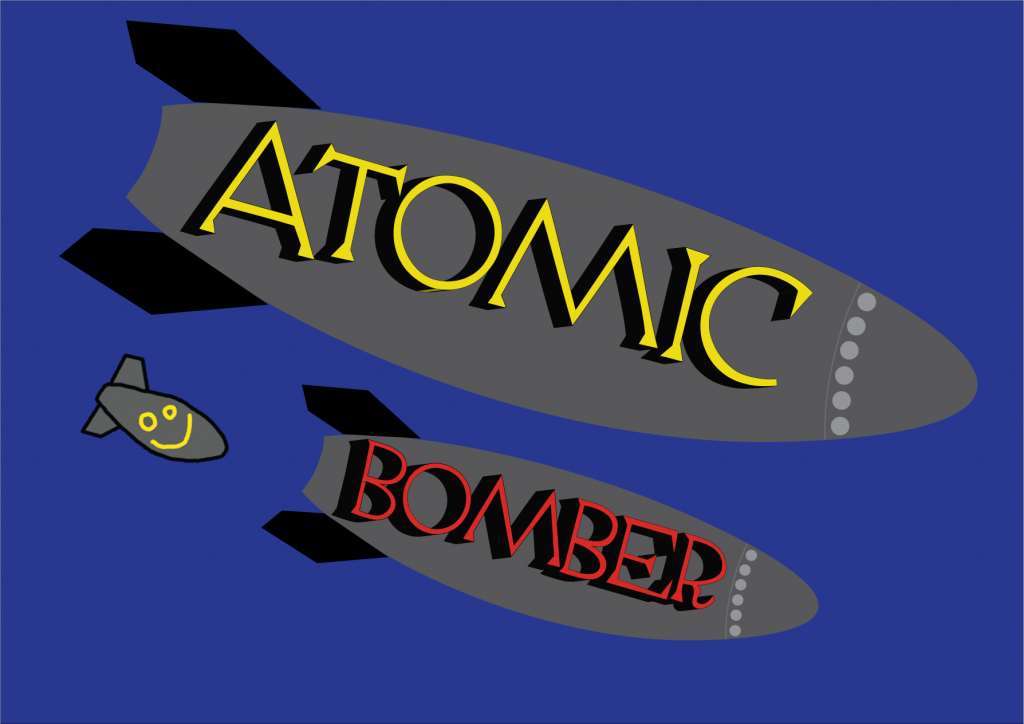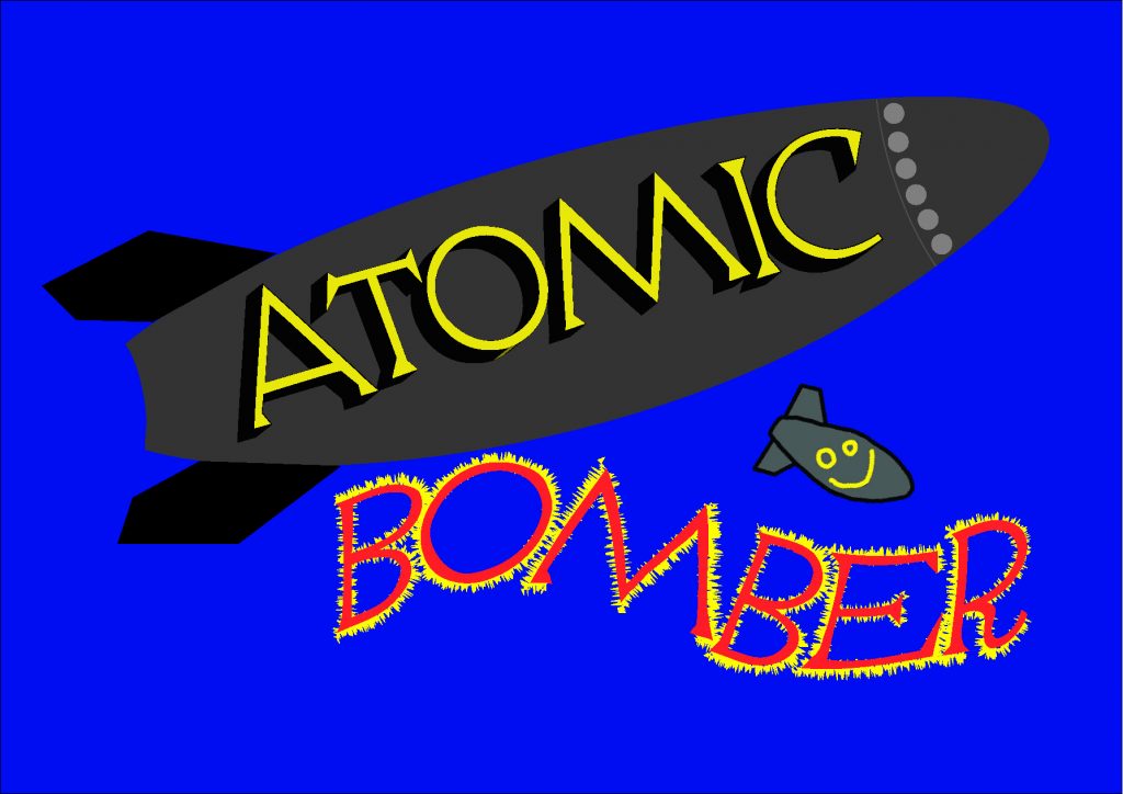 This is the improved version of the Atomic Bomber logo redesign as I think it is a little more visually appealing. I duplicated the bomb and Atomic word and made them smaller so that they had a consistent appearance with the Atomic bomb although I did make the Bomber word red. I also rotated the bombs so that they look like they have been dropped out of a plane.