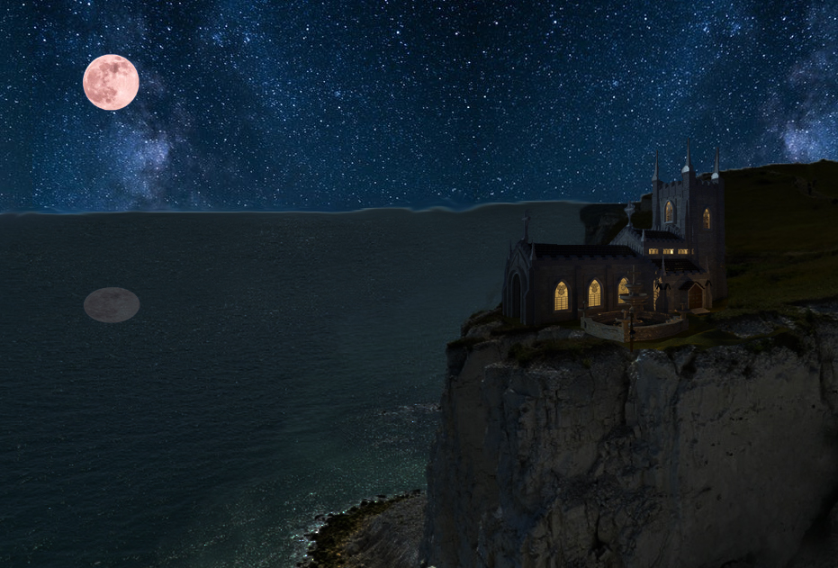 The above image is my first attempt at making the church on the cliff using image manipulation in Photoshop but it wasn’t my first time using Photoshop even though my prior experience wasn’t that in depth and was quite a while ago. I started with an image of a cliff side with a port in the daytime. I used the clone stamp tool to cover up the port with the ocean and I replaced the sky with an image of the night sky. Also, I ‘smudged’ the line (using the smudge tool) between the two images to make the images look better together and I added a moon into the sky. The main part of the image is the church placed on the cliff edge. I took the church from another image and cut it out using the selection tools available in Photoshop. To add some semblance of realism to the image, I added a reflection of the sky in the ocean by copying part of the sky and the moon and flipping it vertically as well as turning the opacity down to around 10%. I also turned the brightness down on the parts that I used from the photo in the day using adjustments. The image turned out pretty well in my opinion although I could have improved multiple parts of the image such as the reflection and the ocean line. Considering I hadn’t used Photoshop for a while I feel like I managed to turn out the image quite quickly but if I had taken more time I could have fixed the issues I mentioned.