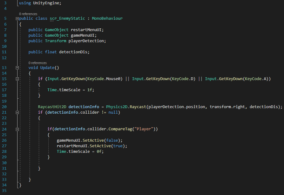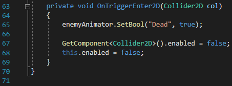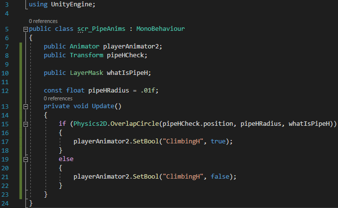 To fix this bug, I had to change how the script for the horizontal pipe movement animation worked so that it is similar to how the pipe climbing function for the vertical pipes works. To do this I used an empty game object linked to the ‘pipeHCheck’ variable and a layer mask linked to a new layer created for the horizontal pipe animation trigger. This meant that the top collider of the player object being disabled no longer stopped the horizontal climbing animation from happening.