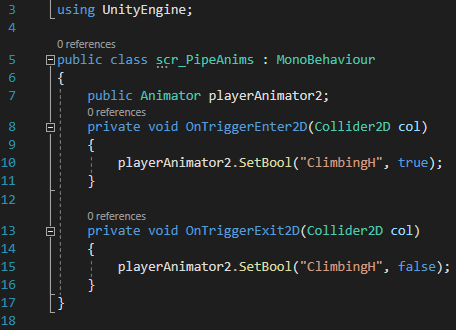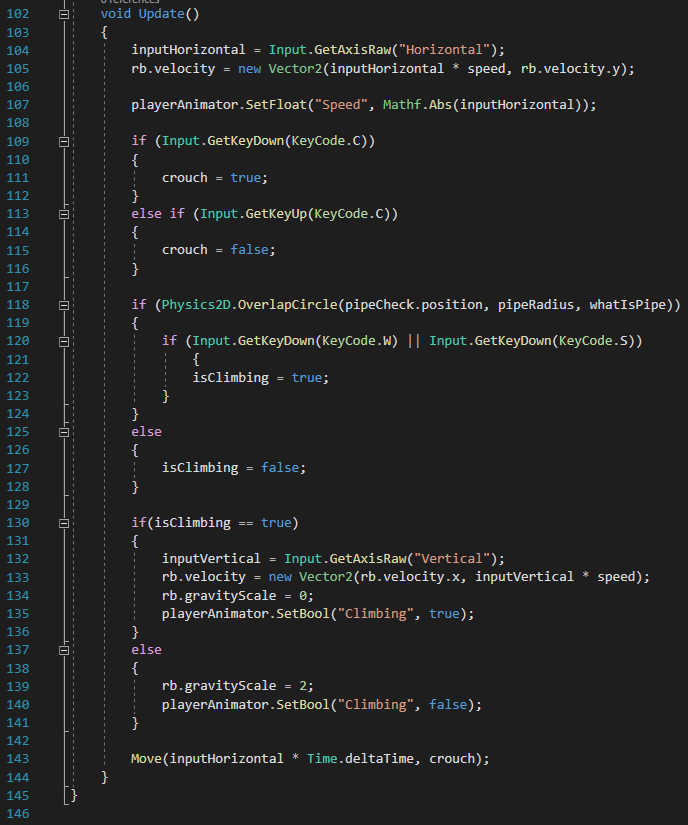 However, while testing these functions I also discovered that the colliders relating to the pipes needed to be adjusted. This is because the player drops too early while vertically climbing so the player can fall if they aren’t in the right position and the colliders activating the player animation to move horizontally are placed too close to the vertical pipes so that they can cause the player animations to glitch out if they don’t navigate the pipes the specific way I did in the first video displaying the player functions correctly.