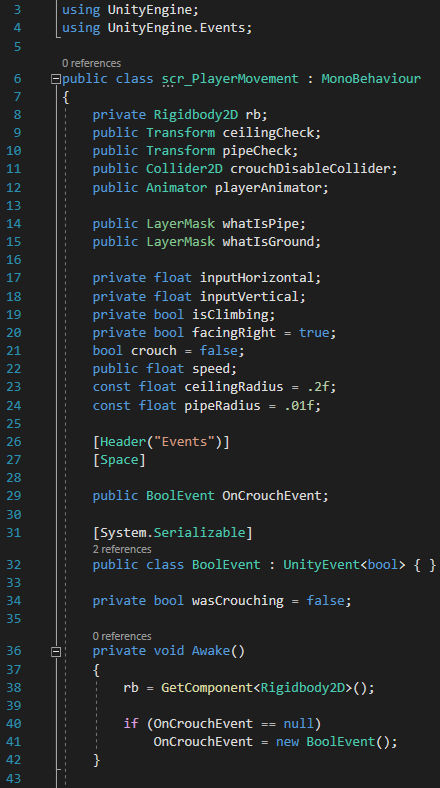 This video shows a bug reported to me by external testers of my game that allows the player to crouch while they are navigating the pipes. This breaks the illusion of the pipes in the game. This happens because the player is still able to enter the crouch animation while climbing which is definitely not intended to happen. This happens because the player collider at the top of the player object is disabled when the player crouches so the game no longer registers the player as being in horizontal pipe animation trigger.