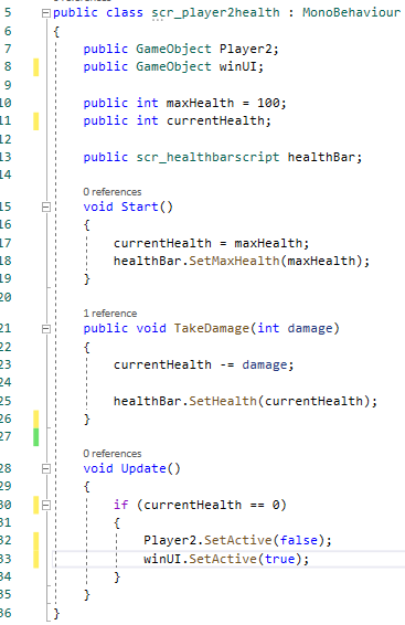 This image shows the script that has the functionality of the first player’s health. The Player GameObject variable links to the player while the winUI2 links to the UI that is displayed when Player 1 dies. The two integers are variables that contain the max health of the player and the current health of the player. The healthBar variable links to the script that controls the health bar of the player so that it has the correct values to display on the bar. The void Start section of the code is used to set the player’s current health to the full health of the player as well as setting the health bar value to the max health. The next part of the code is a function called TakeDamage that is created to allow the player to take damage. It takes the damage integer away from the current health and sets the health bar value to the current health so that it goes down. The last section of this script is used to detect when the player’s health is 0 so that the UI to show that Player 2 has won can be shown as well as disabling Player 1 so that they can no longer move since they lost. The below image shows the script for Player 2 which is very similar with minor differences linking to the Player 2 related values and UI.