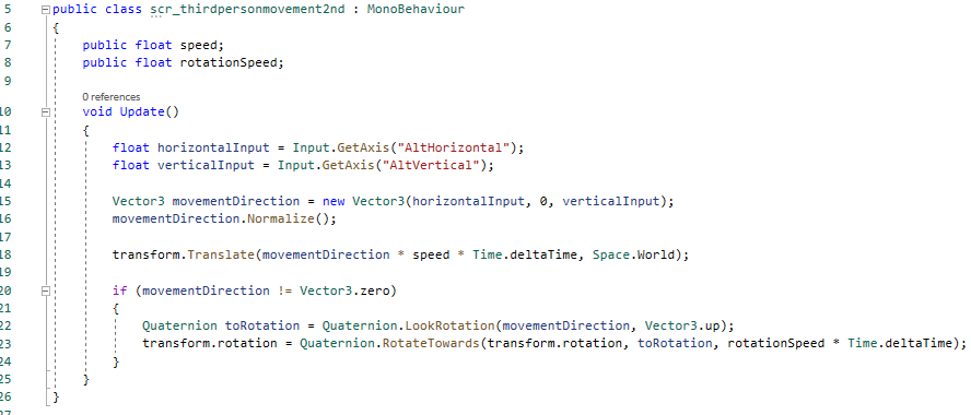 This script is the one that enables the first player character to move around the game environment. The first part of the script is where the variables are set up to enable the script to work. The controller variable links to the character controller of the player and the cam variable links to the camera of the game scene. The speed variable is a float used to set how fast the player moves while the turnSmoothTime and turnSmoothVelocity are floats used to to make the turning of the player character smoother. The first section of code within the void Update section is used to detect the input of movement linked to WASD by using the Horizontal and Vertical input tags and to create a Vector3 linked to these inputs so that the player can be moved using them. The normalized part is at the end of the Vector3 line is used so that the speed of the player doesn’t increase when multiple keys are pressed to get the player to go diagonally. The if section of the code only works if the player is moving because it is looking for the number that represents the input of the player to be higher then 0.1. The first line of the if section is used to make the player turn to the direction they are moving in while the next two are used so that the player doesn’t snap instantly to the direction and instead turns. The last bit of code in the if section is what actually moves the player by determining the direction it needs to move in as well as actually moving the player by using the character controller.