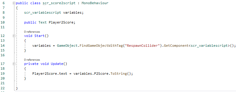 The above image shows the script that controls the Player 1 score UI element. It is very short as all it does is link the score variable to the UI text. The image below shows the script for the Player 2 score UI.