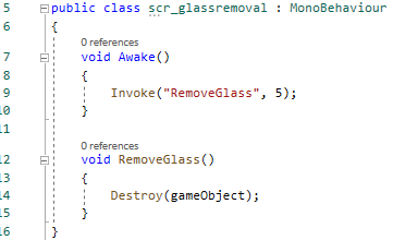 This script removes all of the broken glass from the level after 5 seconds of it being active. This is because the broken glass object consist of many different smaller objects so for performance reasons this isn’t kept for long.