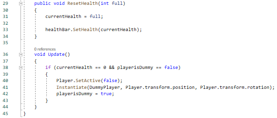This image shows some changes made to the player health scripts. A new function has been added that is used to reset the player health of both players when they respawn. The void Update section has been changed to no longer contain the win condition of the game and instead now creates the dummy version of the player when the health of the player runs out. The playerisDummy bool is used in this code because without it the player dummies are spawned infinitely which is not intended at all.
