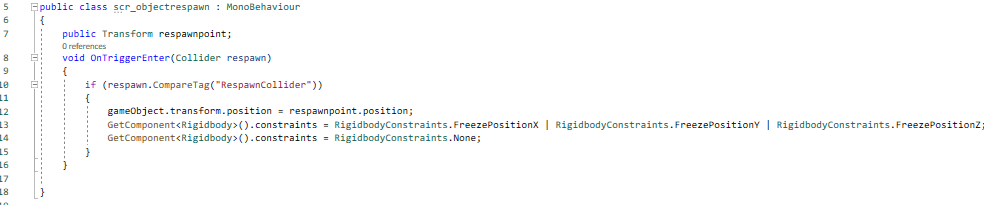 This script is the one that respawns the throwable objects. When the objects are thrown off the map they are respawn in the level at the point set in the variable. Constraints are set and removed on the rigidbodies of the objects so that the force applied to the object isn’t carried over when they respawn.