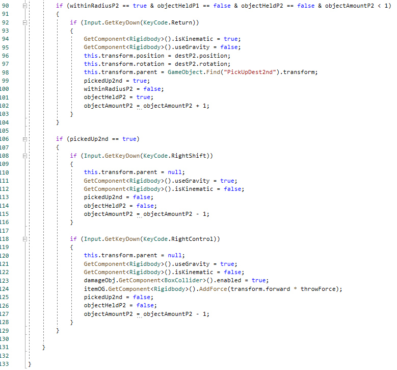 This image shows the functionality for Player 2. It is in the most part the same as the part of the script for Player 1 but instead uses Return/Enter as the key for picking up objects as well as Right Shift for dropping the object and Right Control for throwing the object.