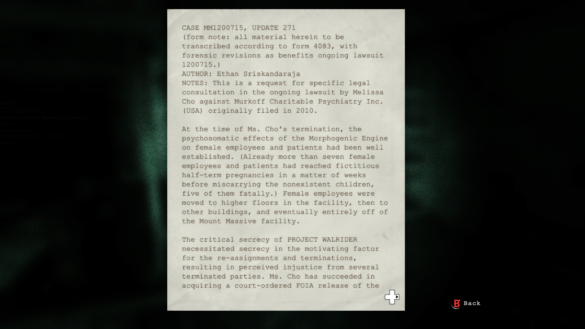 Third Act: The third act consists of searching the lab. This act is more linear but there are still notes and documents containing information on important elements of the story. The player can piece together exactly how the virus spread as they explore this lab. As the player reaches the end of the playable part of the lab, they discover Rian Sanderson hidden away in a locked room. Opening the room starts an alarm that summons a horde of zombies and the story catches up to the situation set up at the start. Operative D-14 lets Nathan Cross and Rian Sanderson leave as they can no longer cope with the guilt of what they have done in service of the Dymon Corporation.