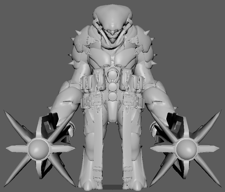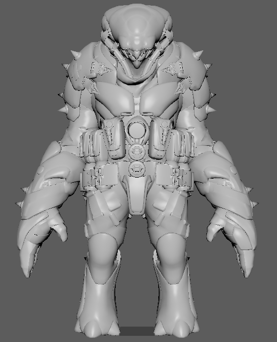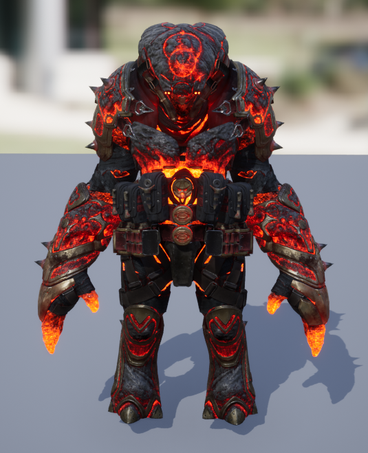 The final character of my piece was the giant. I wanted to get a menacing character model that would also fit in with the set aesthetic of the otherworld. I found this with the Paragon: Grux asset pack as it included a character model of an imposing figure wearing advanced technology. I chose a version of this model that had a magma effect on it’s materials to really make this character stand out when he arrives in the animation. This character pack did come with animations but they weren’t applicable for what I wanted so I brought the model into Maya to remove the weaponry as I wanted the giant to favour physical brute strength rather than weaponry. I also removed some accessories that I didn’t really like from the bottom half of the model.