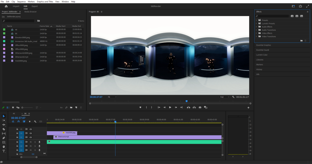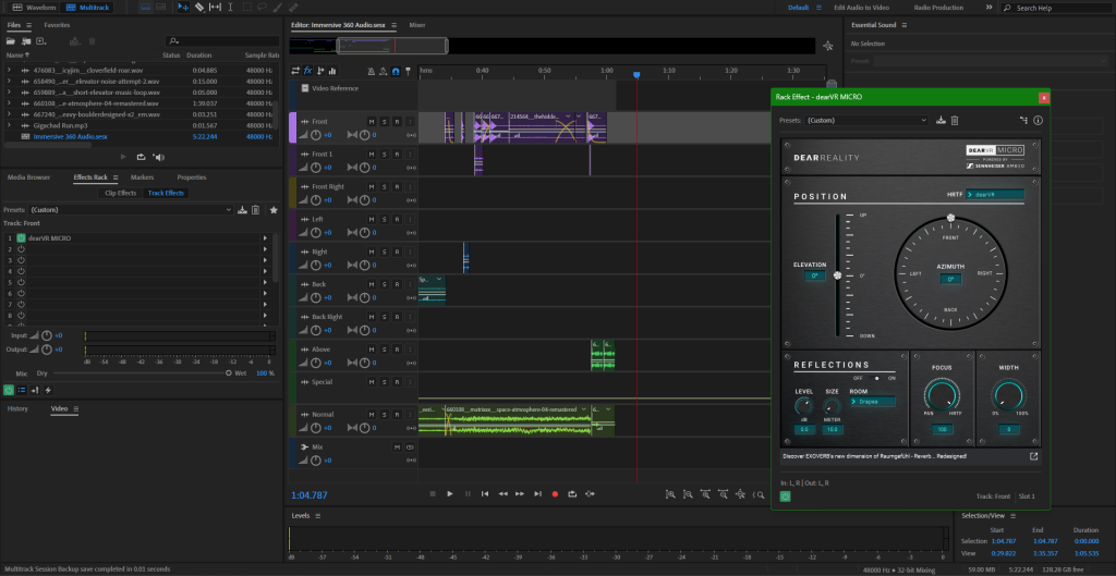To implement audio into my immersive piece I used the DearVR MICRO plugin mentioned before in Adobe Audition to adjust the positions of all my audio files to where they should be. When this was done I exported the combined binaural audio file into Premiere Pro and rendered out the final 360 video.
