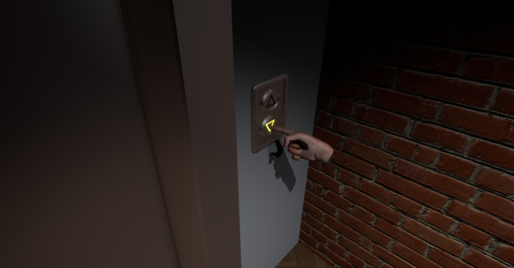 My second test render shows experimentation with implementing the simulated embodiment. This test allowed me to figure out that the camera was a bit too far away from the elevator button as it isn’t realistic for the player to be that far from their hand. I also decided to render in 8K resolution for this test. Compared to the first test there was a noticeable increase in visual fidelity without the render times changing that much. From these results, I decided to render my final project in 8K resolution as higher visual fidelity would better immersive the users.