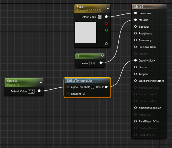 As the majority of this area is dark, this sequence is going to rely on audio and used specific lighting to keep the player captivated. The intention was for the player to be on edge. This sequence starts with the player in the elevator as it is traversing to a different floor before it starts to strangely malfunction as the walls fade into transparency. The light then goes out as a spotlight turns on leading the player to see a glimpse of some mysterious entity. The entity also appears behind the player and then somehow sends the elevator to another strange place. This sequence will have audio of the void spirit talking to the player and audio of the spotlight to lead the player as to where they are supposed to look. To animate this sequence I used three animations that came with the Paragon: Sevarog asset pack to animate the spirit how I wanted as well as keyframing the transform of the spirit character. The rest of the animation involved toggling the visibilities of lights within the scene as well as changing materials. To change the materials of the elevator parts that become transparent I had to add a dither temporal antialiasing part to the material blueprint of the metal connected to opacity mask. This is because metallic materials can’t have their opacity manipulated normally. This is so the opacity of the metal goes down before it switches out with glass so the transition is smoother. This part will fade into the next scene to add to the magical teleportation as the two scenes will overlap momentarily.