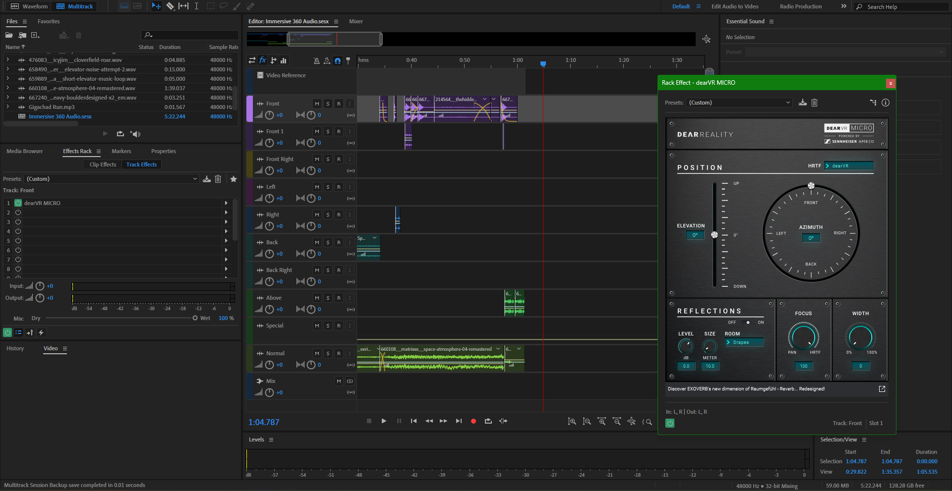 To implement audio into my immersive piece I used the DearVR MICRO plugin mentioned before in Adobe Audition to adjust the positions of all my audio files to where they should be. When this was done I exported the combined binaural audio file into Premiere Pro and rendered out the final 360 video.